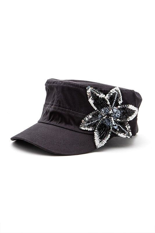 Beaded 3D Flower Cadet Hat Cotton Back Strap Adjustable