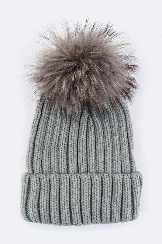 Raccoon Fur PomPom Beanie Acrylic Knit Cozy Modern